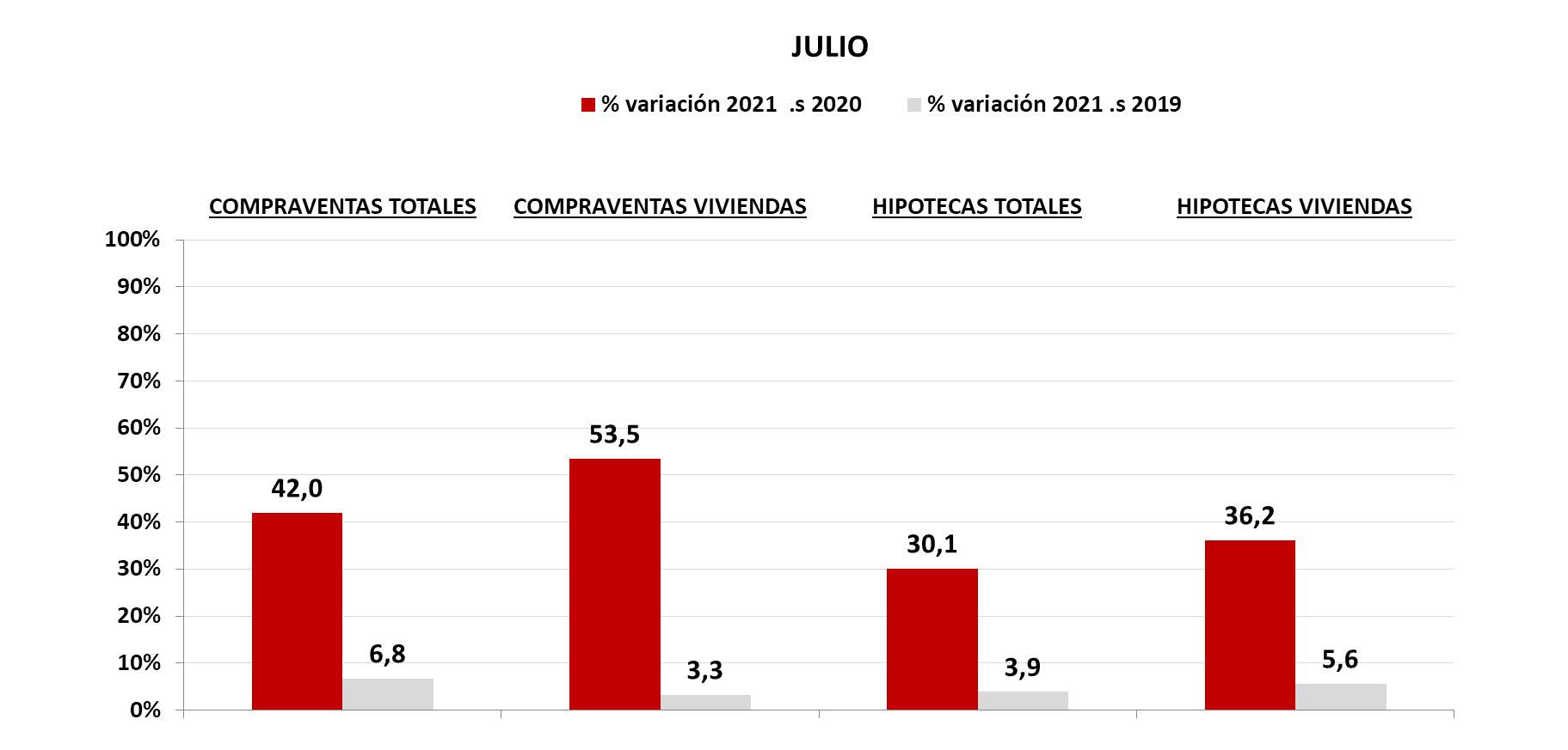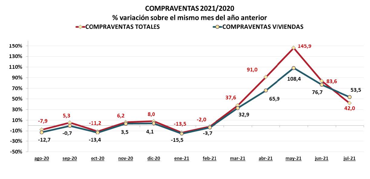 de junio, pero alcanzando en julio incrementos todavía muy elevados, del 42,0% en las compraventas totales, y del 53,5% en las de vivienda. Se detecta por primera vez en los últimos doce meses, un incremento mayor de compraventas de vivienda frente a las compraventas totales.