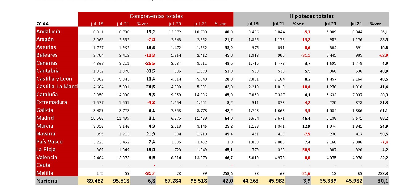 De igual forma, en julio de este año, la evolución positiva experimentada por el sector inmobiliario mostró un incremento en las compraventas de vivienda del 53,5% sobre julio de 2020 y del 3,3% sobre el mismo mes de 2019.