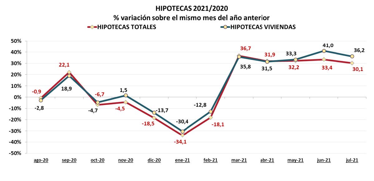 Por último, el análisis mensual de la evolución anual de compraventas e hipotecas inscritas en los registros de la propiedad durante los últimos doce meses, de agosto de 2020 a julio de 2021, mediante la comparación con el mismo mes del año anterior, muestra los siguientes resultados: